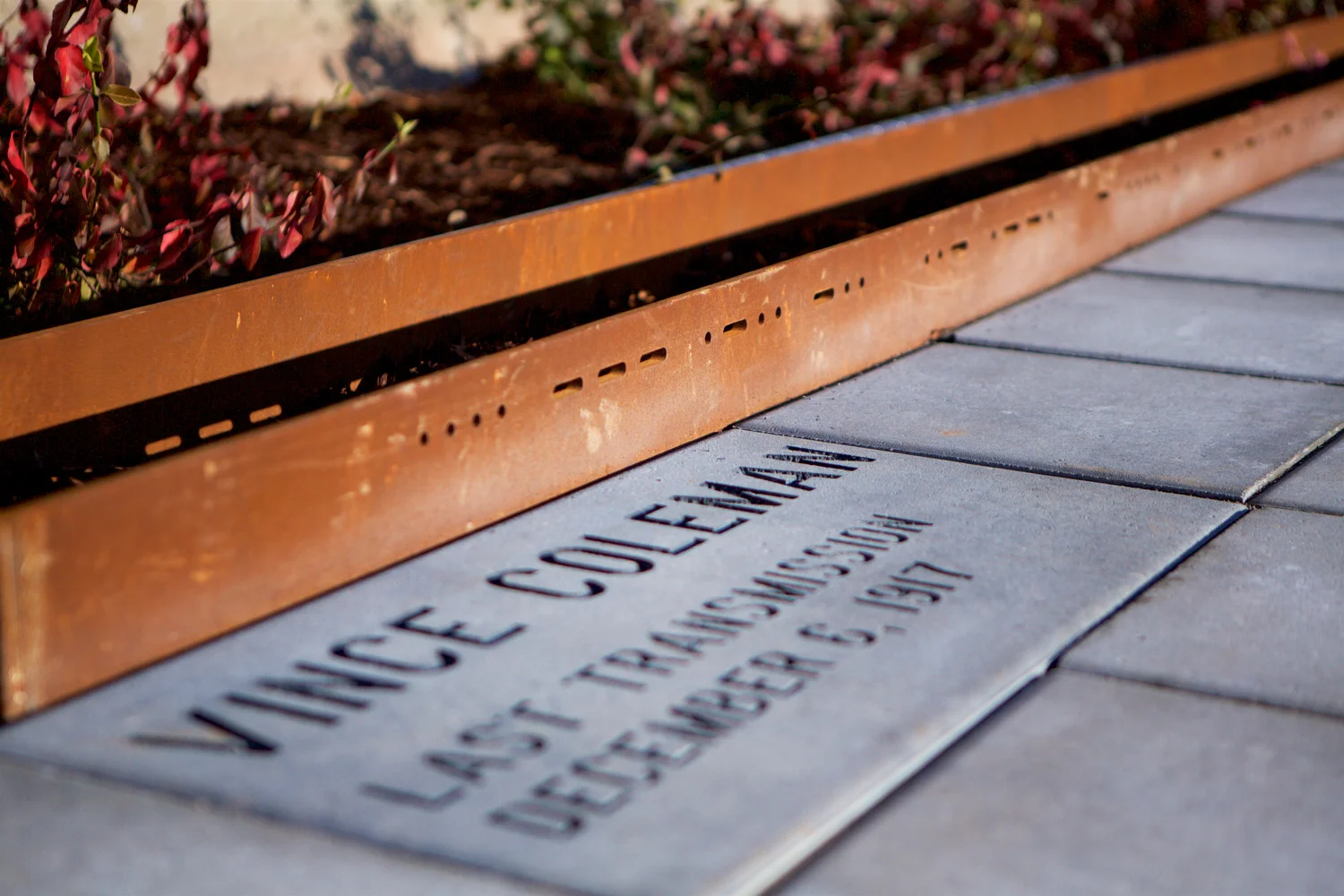 Evocative of a ship, perforations puncture the rusting steel plates above the “waterline” , and rivets make up the remainder of the commemorative date below grade.